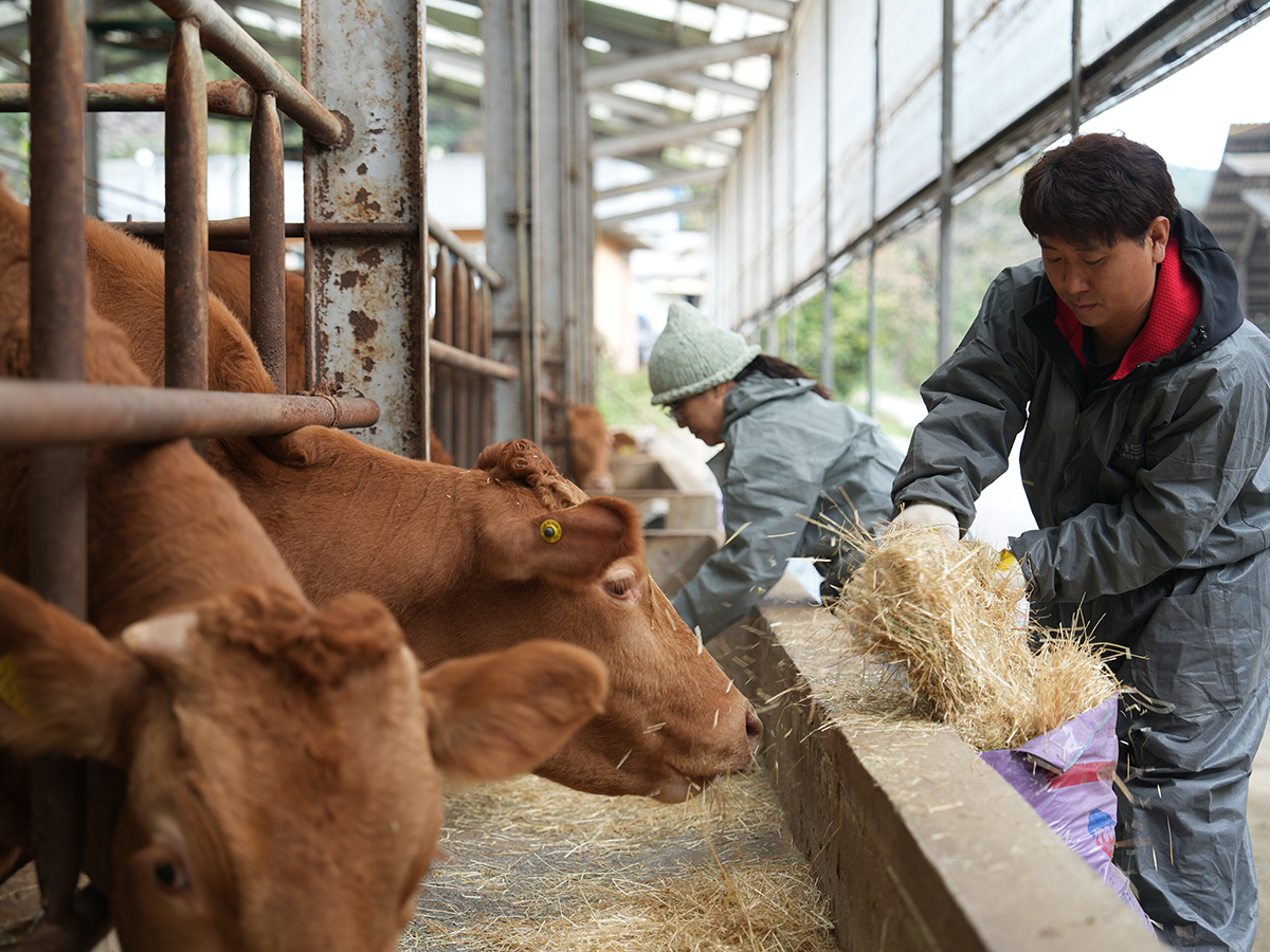 신동리영농조합은 위생적이고 체계적인 시스템으로 최고급 한우를 키우는 친환경 한우 목장입니다. 유전능력이 뛰어난 소 중에서도 송아지를 낳지 않은 미경산 암소를 선별하여 1%에 속하는 최상급 육질로 사육합니다. 무항생제 인증과 발효 사료(TMF)와 배합 사료의 엄격한 비율 조절, 지역 농가와 협력한 청결한 우분 관리로 맛있으면서도 믿고 먹을 수 있는 건강한 한우를 키웁니다.